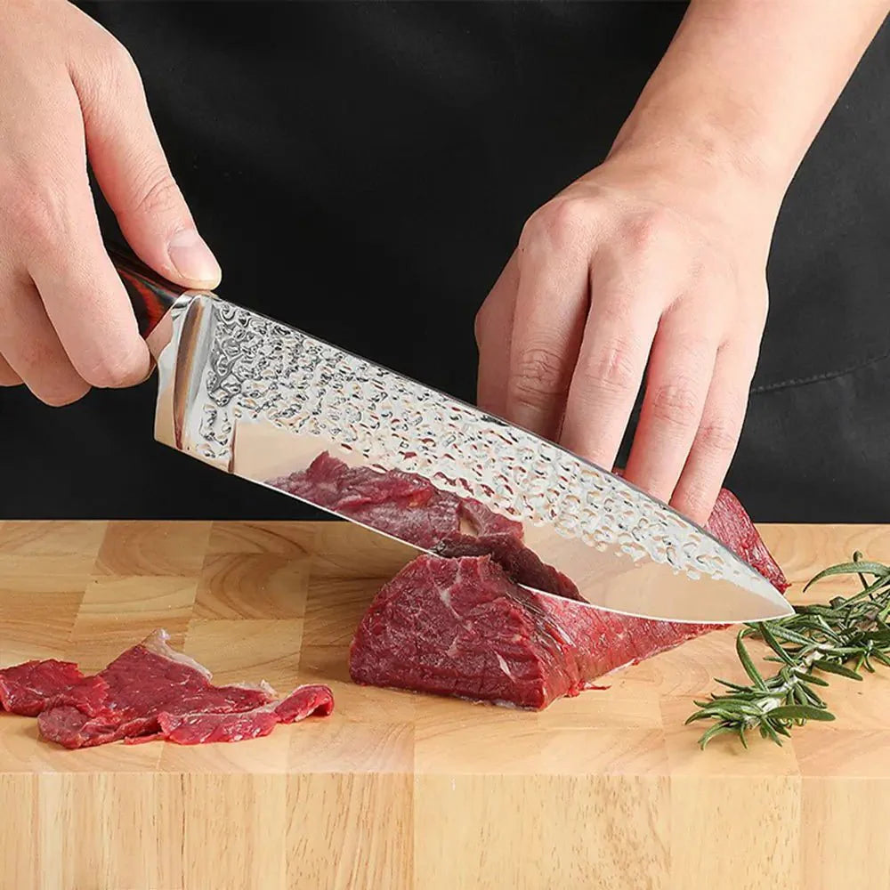 Master every cut in the kitchen with this 15-piece knife block set, a perfect balance of craftsmanship, precision, and lasting performance. Each full-tang blade is forged from high-carbon stainless steel, featuring a hammered finish and a finely honed V-shaped edge that glides through ingredients with minimal effort. From slicing crusty bread to carving tender roasts, the set offers a knife for every task, including a chef’s knife, bread knife, santoku knife, slicing knife, boning knife, utility knife, paring knife, and six steak knives. The sharpening steel keeps edges razor-sharp, while the all-purpose kitchen shears handle everything from trimming herbs to cutting poultry. Each knife is fitted with an ergonomic wooden handle secured by three stainless steel rivets for a secure grip and long-term durability. The solid wood storage block keeps your tools organized and protected, making this knife block set an essential investment for home cooks and professionals who demand performance, comfort, and style in every slice.